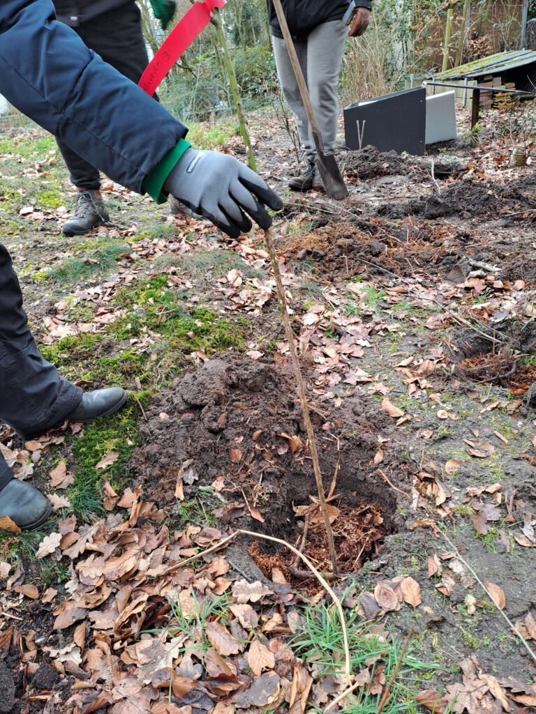 De volgende zaailingen zijn geplant: egelantier, sleedoorn, meidoorn, kamperfoelie, hazelaar, Spaanse aak, vuilboom, kardinaalsmuts, zoete kers en de appelboom (geen consumptie-appel). Dit alles op de kale plekken waar vorig jaar, vanwege de storm, een boom gekapt is. Vlak naast de schuur.