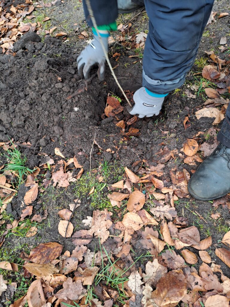 Verder zijn er zaailingen geplant. Eerst is er een gat in de grond gemaakt, waarin eigen compost van de bladhoop, gemengd met dode varens, is gestort. Ten slotte zijn de gaten weer afgedekt met eigen grond.