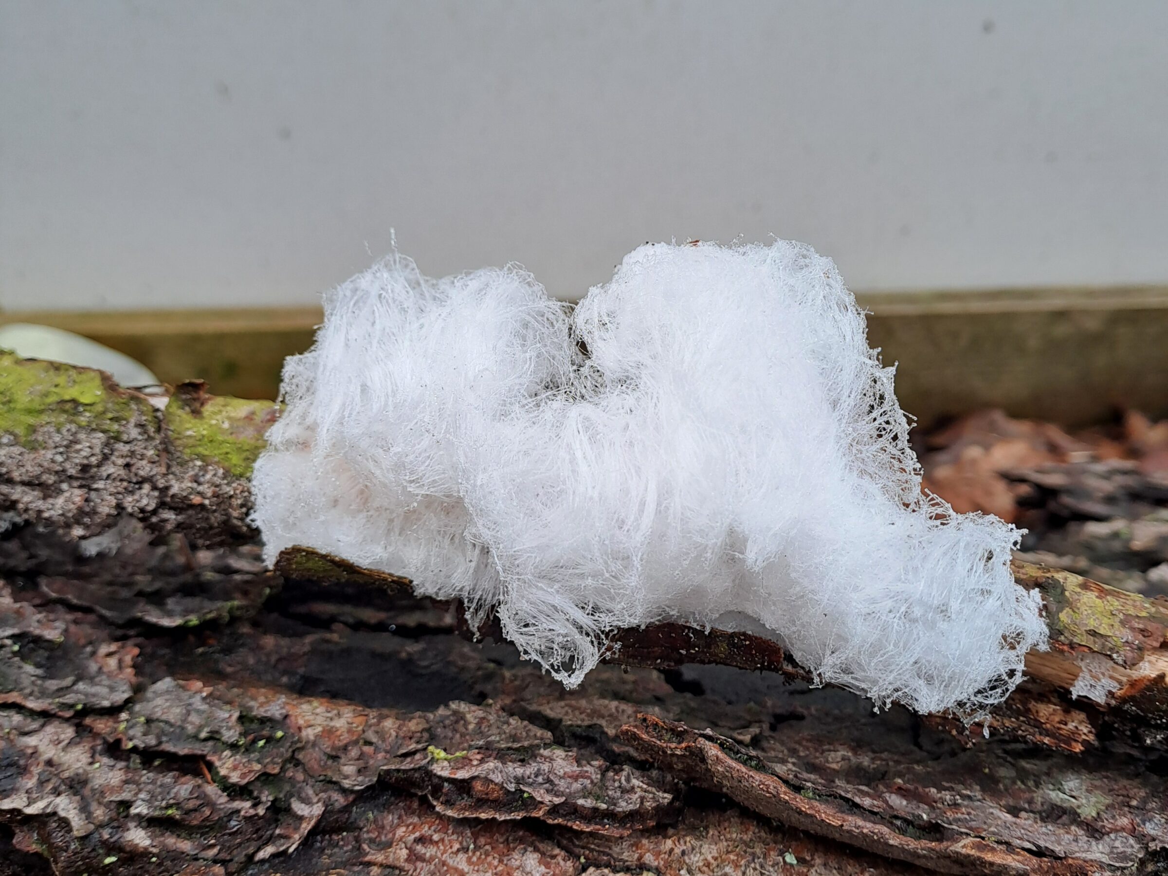 In de heemtuin troffen we op verschillende plaatsen witte pluizen op dood hout. Waarschijnlijk is het ijshaar, een fenomeen dat ontstaat bij lichte vorst en hoge luchtvochtigheid op dood hout. Obsidentify geeft als reactie rozeblauw waskorstje. Maar waarschijnlijk is het ijshaar, gelet op de…